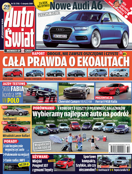 Obietnice i fakty dotyczące ekologicznych rozwiązań stosowanych w motoryzacji; 8 aut różnych klas na wakacje - które najlepsze na rodzinną wyprawę; jak ustrzec się przed pułapkami, wypożyczając samochód; jak bezpiecznie przewozić obszerny bagaż; prezentacje i testy: VW Polo kontra Skoda Fabia, Audi A6, BMW Z4, Mazda 2, Chevrolet Camaro, Ferrari F458 Italia, Audi A4 2.0 TDI e, Toyota Auris 1.33 VTT-i, Volvo V50 1.6 D Drive, Ford Focus CC, Mitsubishi Lancer Ralliart MR; samochody używane: Toyota Corolla TS kontra Ford Focus ST, Peugeot 107 1.0.