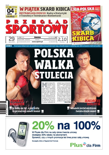 Tomasz Adamek w październiku ma zmierzyć się z Andrzejem Gołotą we Wrocławiu lub w Łodzi; wywiad z Andrzejem Gołotą; Skorża na razie zostaje, pracę straciło dwóch jego asystentów; Roger znów zachwyca; Grzegorz Lato kupuje zbuntowanych baronów; Płatek rezygnuje z Barana i Karwana; wywiad z Dariuszem Kubickim; Polpharma aktywna na rynku transferowym, podpisała 10 kontraktów, chce też reprezentanta Polski Iwo Kitzingera; specjaliści z ośrodka w Denver zbadali pozycję na rowerze Włoszczowskiej i innych zawodniczek polskiej kadry; rozmowa z Otylią Jędrzejczak.
