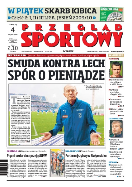 Wielki spór o kilkaset tysięcy złotych między byłym szkoleniowcem Lecha Poznań Franciszkiem Smudą a zarządem klubu; rozmowa z Jackiem Masiotą, szefem rady nadzorczej Ekstraklasy; Wisła Kraków znalazła sprytny sposób na zdobywanie goli po stałych fragmentach gry; Roman Abramowicz szykuje w tym tygodniu wielką ofensywę transferową; Angelo Furlan zwyciężył w drugim etapie Tour de Pologne; wywiad z Nickim Pedersenem.