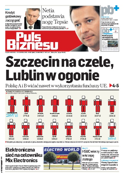 Prezes sieci Mix Electronics zamierza przejąć wszystkie sklepy sieci Electro World w Polsce; z przeprowadzonego przez „PB” rankingu jasno wynika, że polska gospodarka wciąż podzielona jest na Polskę A i B; Mirosław Godlewski, prezes Netii, nie chce rozmawiać z Telekomunikacją Polską o odstąpieniu od separacji funkcjonalnej byłego monopolisty; analitycy największego banku w Europie radzą kupować polską walutę.