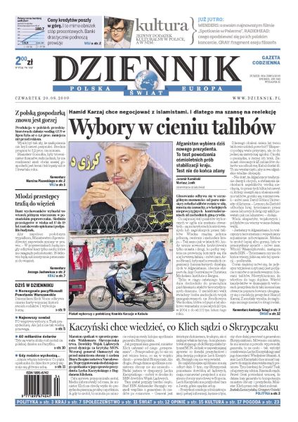 Afganistan wybiera dziś nowego prezydenta; czy generał Skrzypczak po dzisiejszym spotkaniu w Pałacu zostanie w armii; stoczniowcy nie uwierzyli w nowego inwestora z Kataru; samodzielne kupowanie franków szwajcarskich, żeby spłacić kredyt, nie opłaca się; co piąta niania w pracy zajmuje się sobą, a nie dzieckiem; ukazał się świetny tom wywiadów z wybitnym reżyserem Andrzejem Barańskim; Piotr Małachowski wywalczył w Berlinie srebrny medal mistrzostw świata w rzucie dyskiem; Fiat podejmuje kolejną próbę wejścia do Chin; 30 sierpnia na Krakowskim Przedmieściu w Warszawie odbędzie się wielokulturowe warszawskie Street Party.