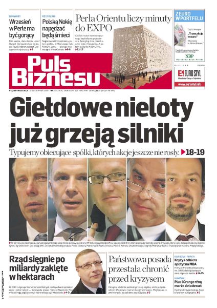 Państwowi pracodawce tną etaty i zamrażają wynagrodzenia z powodu kryzysu; Agencja Nieruchomości Rolnych w przyszłym roku ma szansę podwoić sprzedaż gruntów; we wrześniu dojdzie do kolejnego starcia skonfliktowanych akcjonariuszy lubelskiego browaru Perła; czy firma Kamitec za kilka lat zostanie międzynarodowym koncernem; za 253 dni w Szanghaju odbędzie się otwarcie Światowej Wystawy EXPO 2010; kryzys odebrał wielu osobom szansę na studia MBA; firmy, które od kilku lat realizują programy praktyk, przekonały się, że to przydatne narzędzie rekrutacyjne; zyski Cyfrowego Polsatu okazały się o 10 proc. niższe niż przewidywali analitycy.