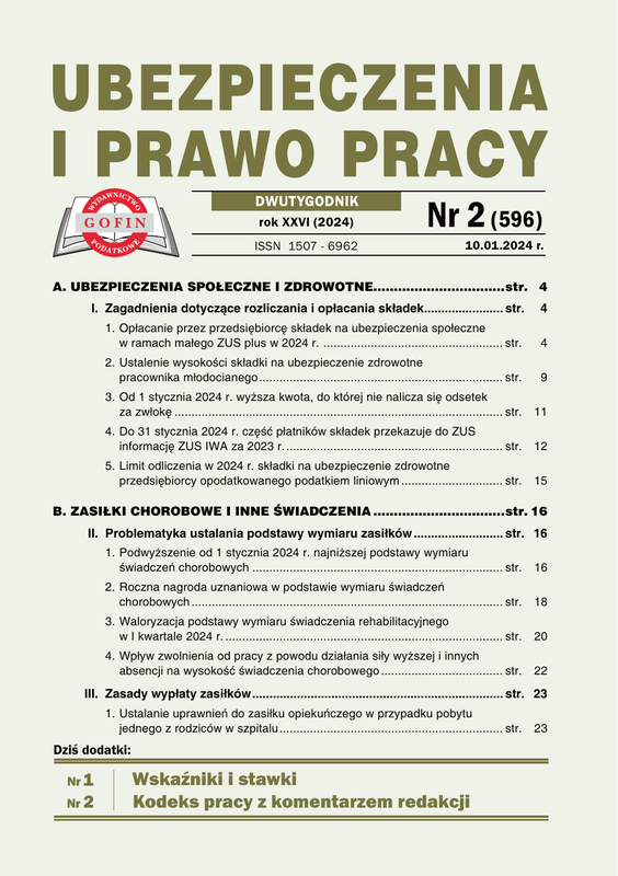 Ubezpieczenia i Prawo Pracy - dwutygodnik o tematyce kadrowo-płacowej, obejmuje zagadnienia z zakresu ubezpieczeń społecznych, ubezpieczenia zdrowotnego, świadczeń z ZUS oraz prawa pracy. W każdym numerze na 68 stronach publikuje tematy zawierające przykłady praktycznych rozwiązań, wzory wypełnionych druków, przydatne pisma, interpretacje organów resortowych i orzecznictwo. Prezentuje odpowiedzi na pytania Czytelników. Zawiera informacje o ważnych terminach oraz zmianach w prawie wraz z komentarzem redakcji.
