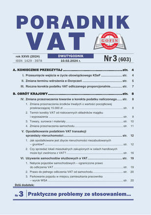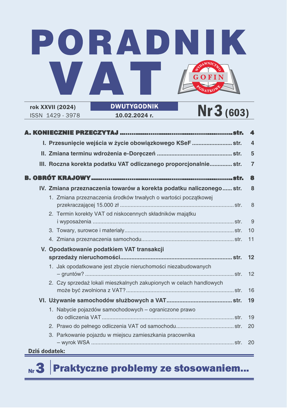 Poradnik VAT - dwutygodnik, który na 68 stronach wyjaśnia i podpowiada, jak w praktyce stosować skomplikowane przepisy podatku VAT. Prezentuje bieżące informacje na temat zmian w przepisach VAT i akcyzy wraz z komentarzami o ich skutkach dla podatników, publikuje interpretacje organów podatkowych oraz orzeczenia sądowe. Odpowiada na pytania Czytelników. Poradnik VAT to czasopismo dla służb finansowo-księgowych, doradców podatkowych, pracowników KAS, jak i przedsiębiorców.