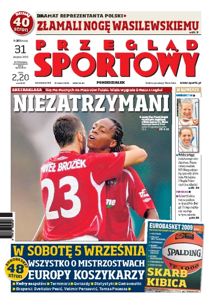 Szczegółowa analiza 5. kolejki piłkarskiej Ekstraklasy; wciąż nie ma mocnych na Wisłę Kraków – mistrzowie Polski wygrali 9. mecz z rzędu; Manchester United pokonał Arsenal Londyn 2:1; wywiad z Mariuszem Lewandowskim, jednym z najważniejszych piłkarzy w składzie Leo Beenhakkera; statystyczne podsumowanie dorobku polskich koszykarzy w sparingach rozgrywanych przed mistrzostwami Europy; rozmowa z Agnieszką Radwańską.