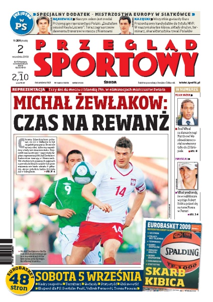 Paweł Golański zastąpi w drużynie narodowej kontuzjowanego Marcina Wasilewskiego; wywiad z Michałem Żewłakowem, kapitanem reprezentacji Polski; mimo odpadnięcia z Ligi Europejskiej piłkarze Lecha Poznań domagają się większych pensji; Wisła Kraków zwolniła Jacka Bednarza – klub zlikwidował stanowisko dyrektora sportowego; Agnieszka Radwańska zmierzy się w II rundzie US Open z Marią Kirilenko.