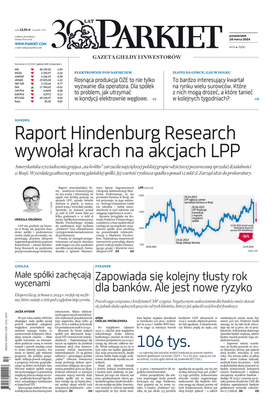 Największy w Polsce newsroom gospodarczy zbiera, analizuje i zgłębia dla Państwa najważniejsze informacje ze świata finansów. Codzienne wydanie „Parkietu”, sześć dni w tygodniu, to kilkadziesiąt artykułów o emitentach, instytucjach finansowych, gospodarce. To również opinie, felietony i wywiady z najważniejszymi ludźmi krajowej i globalnej finansjery.