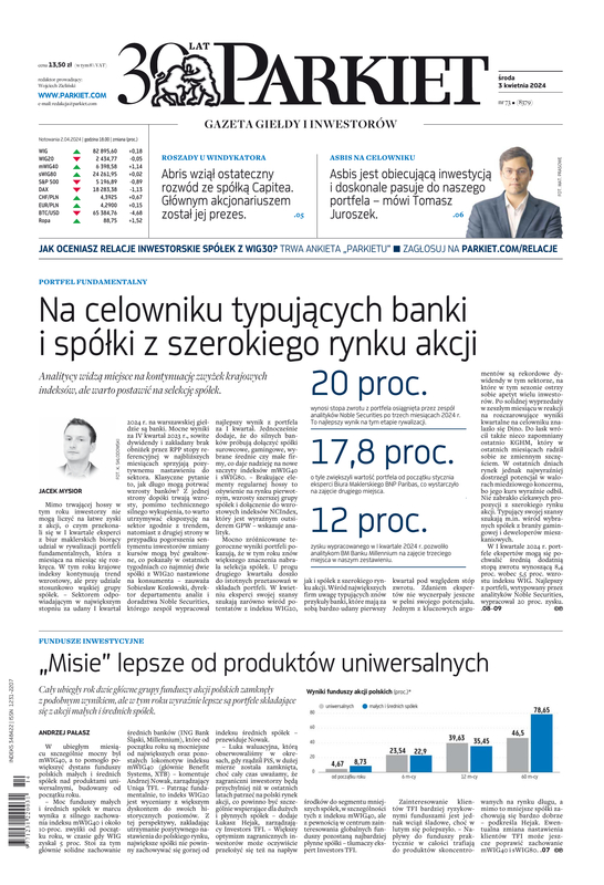 Największy w Polsce newsroom gospodarczy zbiera, analizuje i zgłębia dla Państwa najważniejsze informacje ze świata finansów. Codzienne wydanie „Parkietu”, sześć dni w tygodniu, to kilkadziesiąt artykułów o emitentach, instytucjach finansowych, gospodarce. To również opinie, felietony i wywiady z najważniejszymi ludźmi krajowej i globalnej finansjery.
