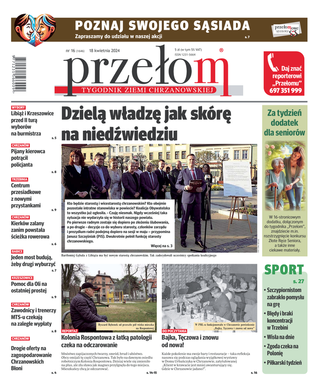 „Przełom” jest jedną z najlepszych i największych gazet lokalnych w Polsce. Powstał 16 września 1990 r. i ukazuje się nieprzerwanie do dziś. Zasięgiem obejmuje obecnie pięć gmin powiatu chrzanowskiego: Alwernię, Babice, Chrzanów, Libiąż i Trzebinię oraz gminę Krzeszowice w powiecie krakowskim i gminę Chełmek w powiecie oświęcimskim. W 1994 r. zdobył I nagrodę IDEE (Fundacji na Rzecz Demokracji w Europie Wschodniej, a w 2000 r. tytuł gazety 10-lecia sygnowany przez premiera rządu RP i ministra kultury. Tytuł dwukrotnie nagradzany przez Narodowy Fundusz Ochrony Środowiska, w 2000 r. zdobył I nagrodę w konkursie dla gazet mających największy wpływ na kształtowanie świadomości ekologicznej.