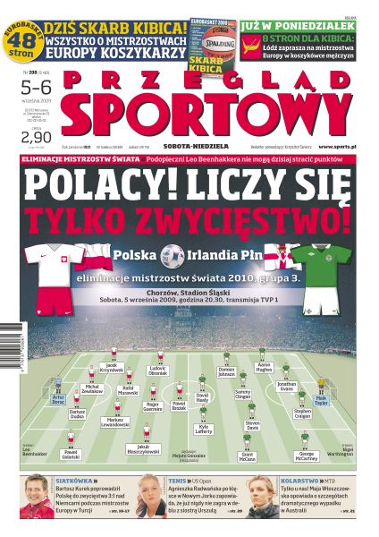 Dziś pierwszy z czterech jesiennych meczów o wszystko kadry Leo Beenhakkera; Ludivik Obraniak opowiada o emocjach przed meczem z Irlandią Północną; polscy siatkarze dzięki wygranej nad reprezentacją Niemiec 3:1 zapewnili sobie wstęp do II fazy tureckiego turnieju; Maciej Lampe opowiada o przygotowaniach do rozpoczynającego się w poniedziałek EuroBasketu; tegoroczny US Open okazał się nieudany dla teamu Radwańskich; Jelena Isinbajewa nie pobiła rekordu świata w skoku o tyczce; Maria Szarapowa chce odzyskać koronę w turnieju US Open.