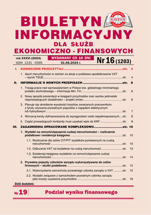 Biuletyn Informacyjny dla Służb Ekonomiczno-Finansowych - ukazuje się co 10 dni. W każdym numerze na 76 stronach wyjaśnia problemy związane ze stosowaniem w praktyce przepisów: o VAT, PIT, CIT, rachunkowości, z prawa pracy i ubezpieczeń społecznych. Podpowiada najlepsze rozwiązania. Podaje najważniejsze i najbardziej aktualne orzecznictwo sądów oraz interpretacje organów podatkowych. Każdy numer zawiera wiele odpowiedzi na pytania Czytelników, przykłady i praktyczne rozwiązania wraz z ewidencją księgową.