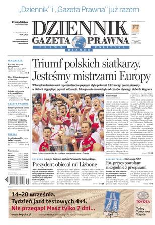 W tureckim Izmirze nasi reprezentanci w pięknym stylu pokonali 3:1 Francję i po raz pierwszy w historii zostali mistrzami Europy; Polska najgorzej w Europie radzi sobie z leczeniem bólu; absurdalne dopiski Jana Klaty do „Ziemi obiecanej” Reymonta; Robert Kubica mówi o swojej przyszłości w wyścigach Grand Prix Formuły 1; fiskus podstępnie sprawdza osobiste konta bankowe; zasiłki rodzinne będą wyższe; rządowe poręczenie kredytu dla firm droższe niż na rynku; plany Magny wobec Opla budzą coraz więcej wątpliwości; kiedy przedsiębiorca może zaliczyć wydatki na reklamę i reprezentację do kosztów podatkowych.