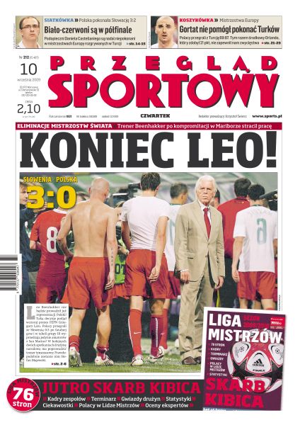Słowenia - Polska 3:0 - za kadencji Leo Beenhakkera tak beznadziejnego występu jeszcze nie oglądaliśmy; prezes PZPN tuż po meczu ogłosił, że zdymisjonował Leo Beenhakkera; Czesi rozgromili San Marino, a Słowacja udowodniła, że reprezentację Irlandii Północnej można pokonać; nasi siatkarze drugi raz niefrasobliwie doprowadzili do tie-breaku, ale wygrali i są już w półfinale; wywiad z Dawidem Murkiem, który radzi jak ograć dzisiejszych rywali; wywiad z Nico Rosbergiem - kierowcą Williamsa; po dwóch zwycięstwach nasi koszykarze przegrali wczoraj pierwszy mecz w mistrzostwach Europy.