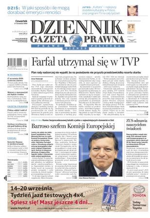 Jose Manuel Barroso został szefem Komisji Europejskiej; nowa matura z matematyki nie będzie trudna - zadania nie są skomplikowane; ponad 1 mld zł zwrócono podatnikom, którzy zapłacili VAT od materiałów budowlanych; ziemia pod budowę dróg będzie przejmowana od razu po decyzji starosty; prezes Farfał nie wpuścił rady nadzorczej do budynków telewizji; od dziś zaczyna nadawać Polsat Futbol, pierwszy w Polsce kanał w całości poświęcony piłce nożnej; nauczyciele, którzy będą chcieli dłużej pracować, nie otrzymają świadczeń kompensacyjnych; ile mogą dorabiać emeryci i renciści bez groźby utraty świadczenia; prywatyzacja ksiąg wieczystych może zlikwidować obecny bałagan.