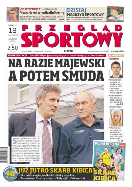 Zarząd PZPN podjął wczoraj decyzję na temat następcy Leo Beenhakkera - na razie zostanie nim Stefan Majewski; po kontuzji Manuela Arboledy trzeci zespół poprzedniego sezonu ma tylko jednego klasycznego środkowego obrońcę; Leszek Miklas opowiada o mistrzostwie Polski, zaufaniu do trenera i dyrektora sportowego, polityce transferowej, odejściu Rogera do AEK Ateny, wzmocnieniach zespołu oraz oczekiwaniach związanych z nowym zespołem; wywiad z Anną Rogowską, mistrzynią świata w skoku o tyczce; złoty medal ME już podniósł wartość praw TV do krajowych rozgrywek.