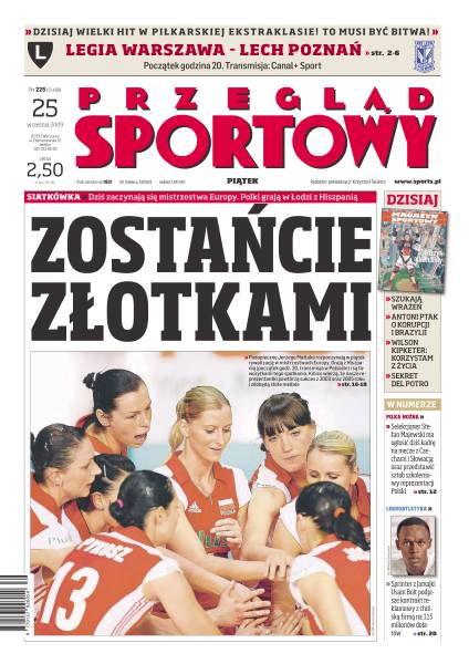 Dziś rozpoczynają się mistrzostwa Europy w siatkówce kobiet, Polki zagrają w Łodzi z reprezentacją Hiszpanii; w wielkim hicie piłkarskiej Ekstraklasy Legia Warszawa zagra z Lechem Poznań; wywiad z Semirem Stiliciem, pomocnikiem Lecha; rozmowa z Pawłem Brożkiem, napastnikiem Wisły Kraków; już niedługo Tomasz Kuszczak może zostać podstawowym bramkarzem Manchesteru United; Robert Kubica wciąż nie wie, w którym teamie będzie jeździł w przyszłym sezonie.