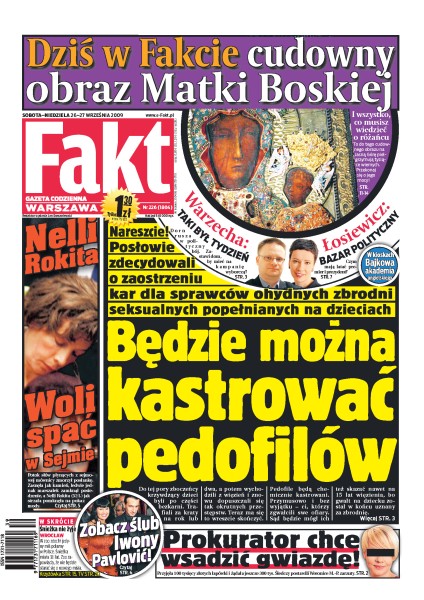 Sejm dopuścił możliwość chemicznego kastrowana pedofilów, prokurator wystąpił o trzymiesięczny areszt dla Weroniki M.-P., jak Nelli Rokita spała na posiedzeniu Sejmu, Iwona Pavlović z „Tańca z gwiazdami” wzięła ślub, tajemnicza brunetka w objęciach Rafała Maseraka, Stefan Majewski powołał nową kadrę, polskie siatkarki wygrały po horrorze, Janusz Wójcik po operacji usunięcia krwiaka. Cudowny obraz Czarnej Madonny i tajemnicza moc różańca.
