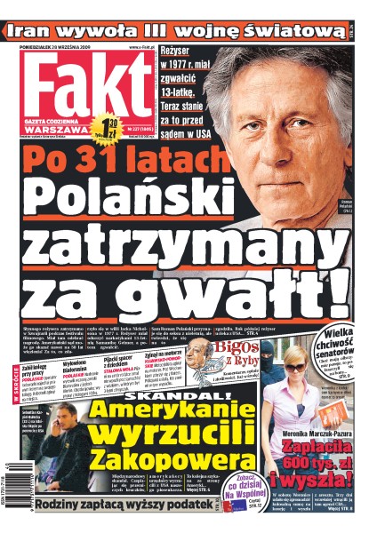 31 lat po gwałcie na nastolatce Roman Polański został zatrzymany w Szwajcarii, Iran i Izrael wcześniej czy później wywołają wojnę nuklearną, muzycy z zespołu Zakopower zostali odesłani z USA do Polski, pazerni senatorowie wyciągają rękę po bony świąteczne, zatrzymano 19 osób urządzających krwawe walki psów, po porażce w Warszawie ujawniły się konflikty w ekipie Lecha Poznań, Robert Kubica zdobył tylko jeden punkt w Singapurze, nasze siatkarki przegrały z Holandią.