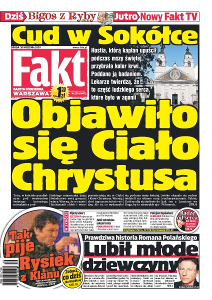 Kto i dlaczego broni Romana Polańskiego, słynny reżyser uważał seks z nieletnimi za normalność, cud w Sokółce – hostia zamieniła się we fragment ludzkiego serca, rządzący a korki w miastach – w Polsce i w USA, prokuratura jeszcze nie wie, czy będzie można oskarżyć Weronikę Marczuk-Pazurę, na dworcu w Poznaniu zasztyletowano młodego człowieka na oczach podróżnych, autokar z 46 pasażerami runął do rowu, Rysiek z „Klanu” nie wylewa za kołnierz, apel Jerzego Dudka do kibiców, Robert Kubica negocjuje kontrakt z Renault.