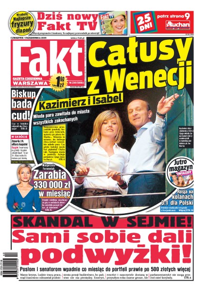 Według Grzegorza Schetyny za rok możliwe są połączone wybory prezydenckie, parlamentarne i samorządowe, w budżecie na przyszły rok rząd zadbał o podwyżki dla posłów i senatorów, minister Cezary Grabarczyk buduje sobie drogę do domu, Kazimierz Marcinkiewicz i Isabel wypoczywają w Wenecji, członkowie rodzin i znajomi posłów nocują na Wiejskiej za pieniądze podatników, Małgorzata Foremniak zarabia kokosy, tak kocha Magda Mołek, polskie siatkarki wygrały z mistrzyniami świata, Stefan Majewski przepisał piłkarskiej kadrze psychologa.