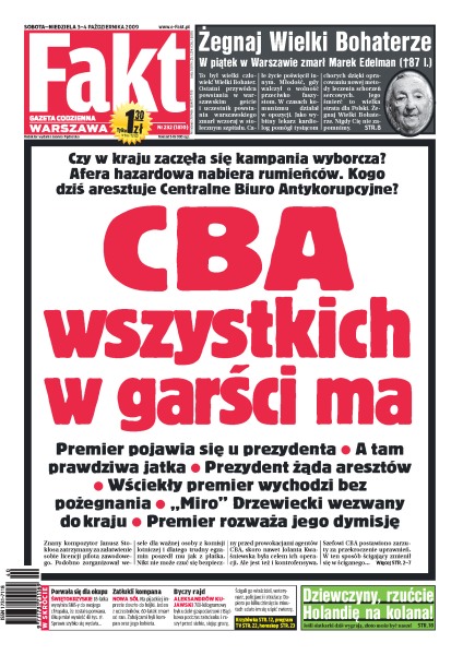 Afera hazardowa: kulisy narady na najwyższych szczeblach w Belwederze, sylwetka Zbigniewa Chlebowskiego, przystojny agent Tomasz z CBA i jego wielkie ofiary, kompozytor Janusz Stokłosa zatrzymany przez CBA za korupcję, już we wtorek szef CBA też może usłyszeć prokuratorskie zarzuty, Kazimierz Marcinkiewicz i Isabel kupują mieszkanie w Warszawie, Justyna Steczkowska będzie miała nowy nos, polskie siatkarki walczą o mistrzostwo Europy, o Roberta Kubicę walczy też zespół Toyoty.