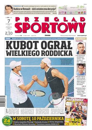 Łukasz Kubot w I rundzie China Open wyeliminował szóstą rakietę świata Andy'ego Riddicka; wczoraj francuskie media ogłosiły, że Robert Kubica podpisał kontrakt z teamem Renault - ani Polak, ani koncern nie potwierdziły jeszcze tej informacji; Stefan Majewski spośród pięciu napastników wybierze duet, który w Pradze ma dać biało-czerwonym bezcenne zwycięstwo; wywiad z Ireneuszem Jeleniem, napastnikiem reprezentacji Polski; Hernan Rengifo mógł wyjechać na zgrupowanie kadry Peru dopiero po meczu Młodej Ekstraklasy; wywiad z Michałem Kościuszką, rajdowym wicemistrzem świata JWRC; Jerzy Matlak wypowiada się na temat Niemczyka, Makowskiego i swojej drużyny.