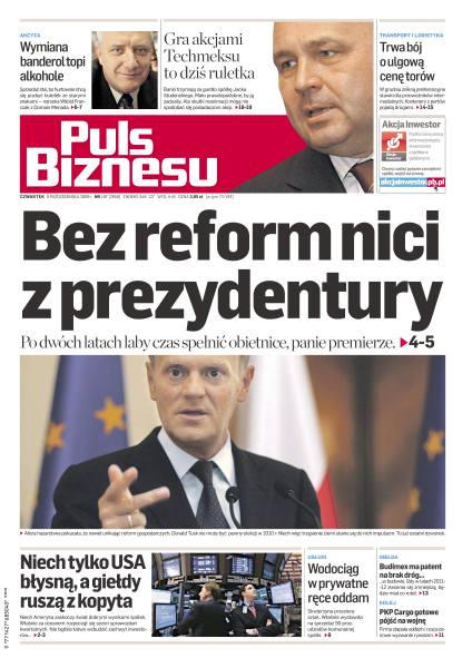 Afera hazardowa pokazała, że nawet unikając reform gospodarczych, Donald Tusk nie może być pewien elekcji w 2010 roku; rusza sezon raportów kwartalnych - oby znów były lepsze od oczekiwań; producenci i importerzy alkoholi mocnych oraz win są załamani - rynek sparaliżowała ręka fiskusa; prognoza wielkości przewozów PKP Cargo na przyszły rok wynosi 112 mln ton; Dariusz Blocher ostrzega branżę przed spadkiem drogowych zleceń do EURO 2012; zmiany w cenniku dostępu do infrastruktury kolejowej mogą sprawić, że przewozy intermodalne będą nieopłacalne; Techmex to kolejna ofiara kredytowej posuchy, operacyjnie ma się jednak czym pochwalić.