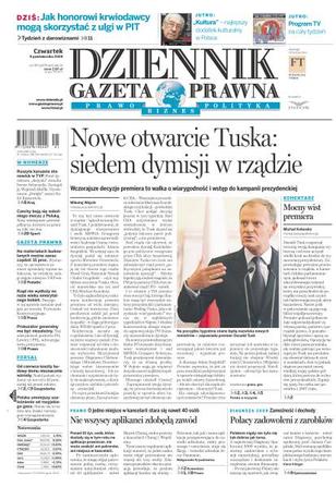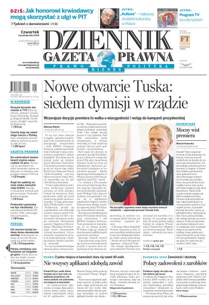 Wczorajsze decyzje premiera to walka o wiarygodność i wstęp do kampanii prezydenckiej; jak honorowi krwiodawcy mogą skorzystać z ulgi w PIT; wczoraj podzielono najważniejsze stanowiska w TVP; co trzecia polska rodzina ma oszczędności, dzięki temu nawet w czasie kryzysu czuje się bezpiecznie; Bruksela zrobi wszystko, by zmusić Czechów do ratyfikacji traktatu; Ministerstwo Kultury i PISF zainaugurowały bezprecedensowy projekt pod nazwą Filmoteka Szkolna; Ziggy Rozalski, były menedżer Andrzeja gołoty, a obecnie Tomasza Adamka, wypowiada się o polskiej walce stulecia; rząd nie wydłuży teraz wieku emerytalnego kobiet; jakie wydatki na rzecz ZFŚS firma może zaliczyć do kosztów.