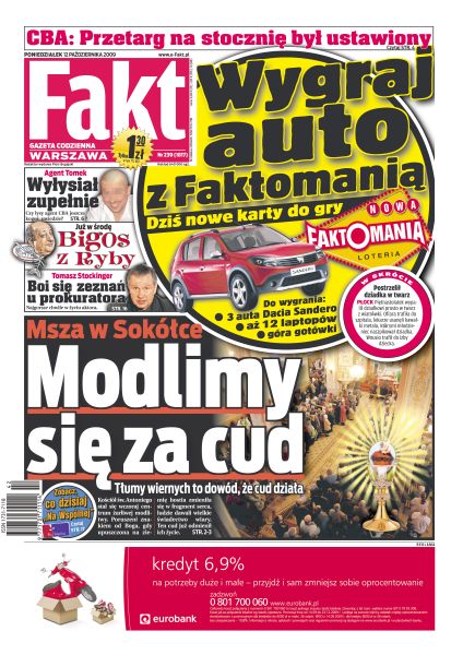 Nieprzebrane tłumy w kościele w Sokółce to dowód, że głęboka wiara wypełnia coraz więcej ludzkich serc; CBA ujawnia aferę stoczniową - urzędnicy mieli tak ustawić przetarg, by wygrała go firma z Kataru; agent Tomek jeszcze niedawno wyglądał jak prawdziwy latynoski amant; sejm spływa wódką - tylko w jeden dzień Fakt przyłapał trzech posłów, którzy wnosili alkohol do gmachu parlamentu; sadysta z Inowrocławia zabił już trzynaście zwierzaków; Cezary Pazura chce zabronić córce wszelkich kontaktów z uwikłaną w aferę korupcyjną macochą; Tomasz Stockinger przeżywa najtrudniejsze chwile w swoim życiu, czekając na przesłuchanie; reprezentacja Polski w żenującym stylu pożegnała się z marzeniami o wyjeździe na mundial.