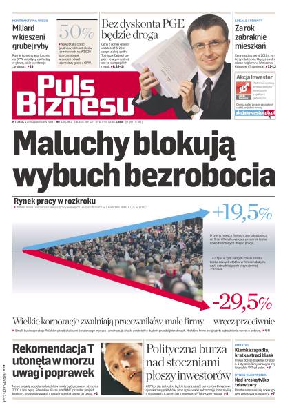 Wielkie korporacje zwalniają pracowników, małe firmy - wręcz przeciwnie; od stycznia nie będzie już można odliczać 22 proc. VAT od paliw do pojazdów z kratką; oferta publiczna PGE będzie dla potentata raczej symbolicznym wsparciem; stoczniowa awantura utrudnia prywatyzację - potencjalni kupcy są bardzo wstrzemięźliwi; we wrześniu producenci znów zanotowali dodatnią dynamikę; kryzys najszybciej skończy się na rynkach mieszkaniowych Warszawy, Krakowa i Trójmiasta; działki pod inwestycje komercyjne ciągle tanieją; gęstnieje sytuacja na rynku grudniowych kontraktów terminowych na WIG20.