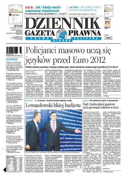 Euro 2012 wymusza zmianę cywilizacyjną, policjanci masowo uczą się języków obcych; przemoc w rodzinie staje się coraz większym problemem Polaków; na Ukrainie rozpoczęła się kampania prezydencka – faworytami są Wiktor Janukowicz i Julia Tymoszenko; 3 listopada PZPN ogłosi nazwisko nowego selekcjonera reprezentacji Polski, o stanowisko ubiega się już 11 kandydatów; w 2010 roku zabraknie w Polsce syndyków z licencją; ile zarobią polskie firmy na budowie gazoportu w Świnoujściu.