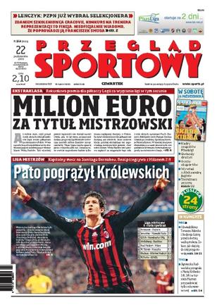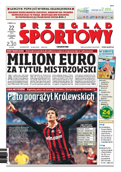 Aż milion euro obiecali szefowie Legii Warszawa swoim piłkarzom za wywalczenie w tym sezonie mistrzostwa Polski; wywiad z Orestem Lenczykiem, trenerem Cracovii; AC Milan pokonał Real Madryt 3:2; według ekspertów Andrzej Gołota w walce z Tomaszem Adamkiem może mieć wielkie problemy; Agnieszka Radwańska odpadła z turnieju tenisowego w Moskwie; w koszykarskiej Eurolidze Prokom Gdynia przegrał z Oldenburgiem 81:87.