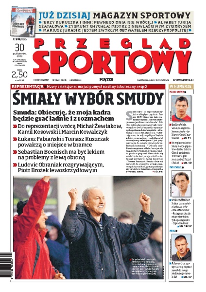 Franciszek Smuda został nowym trenerem piłkarskiej reprezentacji Polski, selekcjoner zapowiada, że ma pomysł na silny i skuteczny zespół; zarobki kierowców Formuły 1 w sezonie 2009; Tomasz Adamek pisze list do Andrzeja Gołoty; rozmowa z Robertem Kubicą; Zagłębie Lubin pokonało Polonię Bytom 2:0; wywiad z Łukaszem Gargułą; Orlando Magic, zespół Marcina Gortata, pewnie pokonali Philadelphia 76ers 120:106.