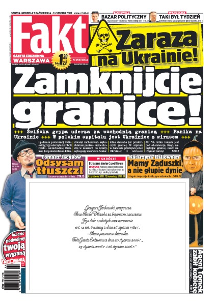 Świńska grypa atakuje – panika na Ukrainie, przy suto zastawionych stołach urzędnicy debatowali o bezrobociu, prawdziwa ofiara agenta Tomka po wypadku 11 lat temu, były gangster od „Oczki” czuwa dziś w hospicjum przy umierających pacjentach, Agnieszka Dygant chce wyprowadzić się z Warszawy, Beata Tyszkiewicz na zakupach w markecie, lista pilnych zadań dla Franciszka Smudy, Agnieszka Radwańska wyszła na kort i wygrała mnóstwo pieniędzy, lista najlepiej zarabiających sławnych nieboszczyków.