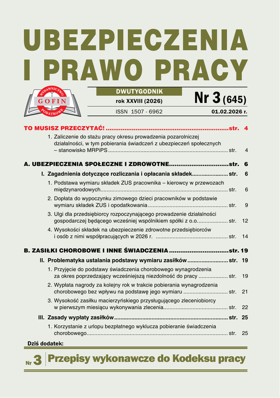 Ubezpieczenia i Prawo Pracy - dwutygodnik o tematyce kadrowo-płacowej, obejmuje zagadnienia z zakresu ubezpieczeń społecznych, ubezpieczenia zdrowotnego, świadczeń z ZUS oraz prawa pracy. W każdym numerze na 68 stronach publikuje tematy zawierające przykłady praktycznych rozwiązań, wzory wypełnionych druków, przydatne pisma, interpretacje organów resortowych i orzecznictwo. Prezentuje odpowiedzi na pytania Czytelników. Zawiera informacje o ważnych terminach oraz zmianach w prawie wraz z komentarzem redakcji.