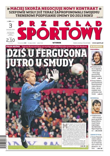 Tomasz Kuszczak liczy na występ w Lidze Mistrzów przeciw CSKA Moskwa; debata o problemach polskiej piłki nożnej; Filippo Inzaghi i Raul mają na swoim koncie po 68 goli w europejskich pucharach; wywiad z Kamilem Kosowskim, piłkarzem Apoel Nikozja; trener Wisły Kraków rozpoczął rozmowy o nowej, 3-letniej umowie; dziś polscy siatkarze w pierwszym meczu w Katarze zmierzą się z ekipą gospodarzy Al-Arabią Doha; skandal w Polskim Związku Kolarskim - prezes W. usłyszał zarzuty i czeka na rozprawę sądową.