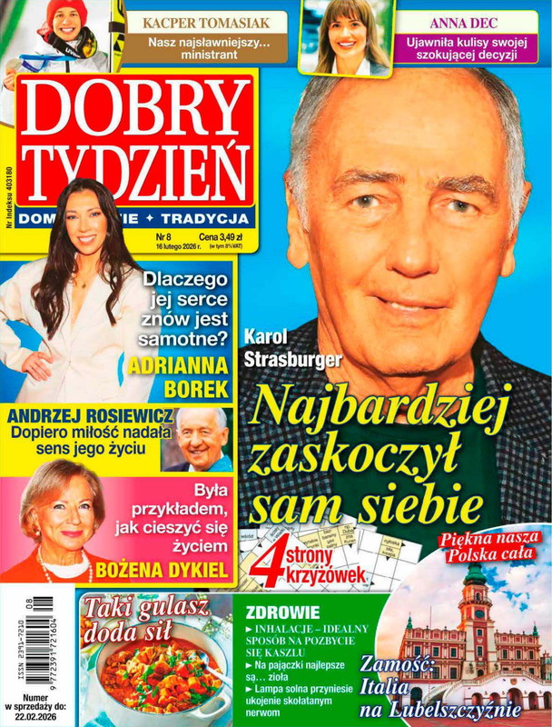 Tygodnik Dobry Tydzień to kolorowy magazyn inny niż wszystkie! Co tydzień udowadnia, że gwiazdy to nie tylko pogubieni skandaliści, ale osoby takie jak Ty, dla których tradycja, rodzina, wiara i dobro są drogowskazami. Pokazuje, że małe cuda dzieją się w życiu i sławnych, i zwykłych ludzi. Ocala od zapomnienia bohaterki i bohaterów, dzięki którym Polska jest wolna. Dobry Tydzień przypomina niezwykłe historie świętych, udowadniając, że droga do świętości nie jest nudna. W tygodniku znajdziesz też kalendarium katolika z patronem, a także poruszającym Słowem Bożym na każdy dzień. Magazyn co tydzień zabiera na pielgrzymkę do najpiękniejszych polskich sanktuariów.