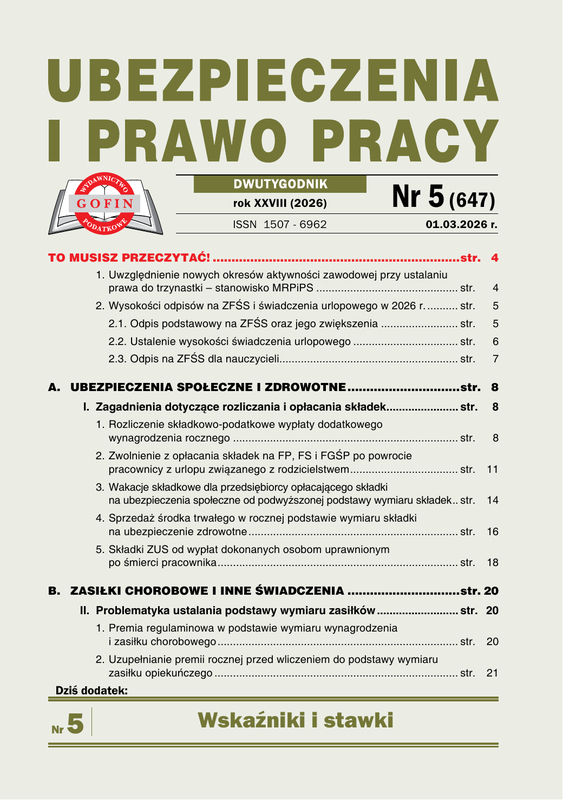 Ubezpieczenia i Prawo Pracy - dwutygodnik o tematyce kadrowo-płacowej, obejmuje zagadnienia z zakresu ubezpieczeń społecznych, ubezpieczenia zdrowotnego, świadczeń z ZUS oraz prawa pracy. W każdym numerze na 68 stronach publikuje tematy zawierające przykłady praktycznych rozwiązań, wzory wypełnionych druków, przydatne pisma, interpretacje organów resortowych i orzecznictwo. Prezentuje odpowiedzi na pytania Czytelników. Zawiera informacje o ważnych terminach oraz zmianach w prawie wraz z komentarzem redakcji.