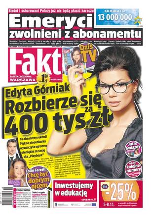 Edyta Górniak rozbierze się za 400 tys. zł; Trybunał Konstytucyjny opowiedział się po stronie najuboższych i zwolnił ich z płacenia haraczu na RTV; Ryszard Kalisz przechodzi ciężkie chwile - czy rozstanie z żoną będzie go kosztowało połowę majątku; lider zespołu Lady Pank Jan Borysewicz stracił nad sobą panowanie; ukochany Alicji Bachledy-Curuś wreszcie przemówił; siostra Jana Nowickiego w jego 70. urodziny opowiada o dzieciństwie aktora; już jutro największy hit jesieni w naszej ekstraklasie, Wisła Kraków zagra z Legią Warszawą.