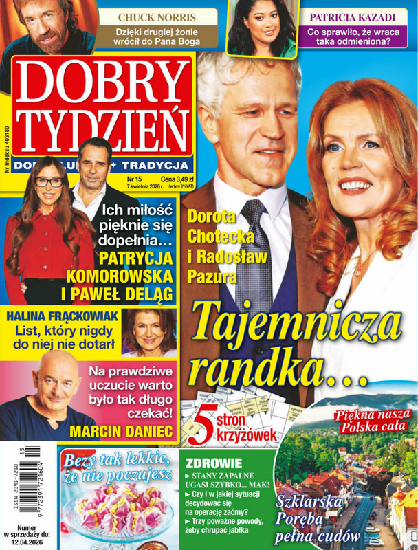 Tygodnik Dobry Tydzień to kolorowy magazyn inny niż wszystkie! Co tydzień udowadnia, że gwiazdy to nie tylko pogubieni skandaliści, ale osoby takie jak Ty, dla których tradycja, rodzina, wiara i dobro są drogowskazami. Pokazuje, że małe cuda dzieją się w życiu i sławnych, i zwykłych ludzi. Ocala od zapomnienia bohaterki i bohaterów, dzięki którym Polska jest wolna. Dobry Tydzień przypomina niezwykłe historie świętych, udowadniając, że droga do świętości nie jest nudna. W tygodniku znajdziesz też kalendarium katolika z patronem, a także poruszającym Słowem Bożym na każdy dzień. Magazyn co tydzień zabiera na pielgrzymkę do najpiękniejszych polskich sanktuariów.