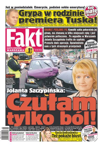 Jolanta Szczypińska po wypadku w Warszawie trafiła do szpitala, po czym przeszła dwie operacje - opowiedziała nam o tych strasznych przeżyciach; kuzynka premiera zapadła na wirusa A/H1N1 - na szczęście szybko trafiła pod opiekę specjalistów i jest już zdrowa; policjanci pobili Bartosza Dyczewskiego za piwo; Gosia Andrzejewicz będzie pozować nago; żona Cezarego Pazury chce być aktorką; w Gdańsku Korona przerwała serię porażek; rezerwowy Miroslav Radovic zaskoczył obrońców Wisły, jego gol dał Legii zwycięstwo.