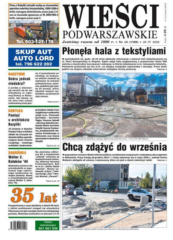 Wieści Podwarszawskie istnieją od 1990 roku i od 27 lat w każdą środę ukazuje się nasz nowy numer. Od samego początku jesteśmy gazetą płatną, niezależną, utrzymującą się z reklam i sprzedaży. Gazetę tworzą profesjonalni dziennikarze z kilkunastoletnim stażem, którzy opisują wszystko, co dzieje się na terenie powiatu wołomińskiego, nie zważając na opcje polityczne. Nasze materiały, którymi nierzadko zmieniamy lokalną rzeczywistość, są cytowane przez ogólnopolskie media, stając się tematem ich interwencji.Od 26 lat bierzemy udział we wszystkich najważniejszych wydarzeniach lokalnych i mamy bezpośredni kontakt z Czytelnikami. Przez ten czas witaliśmy i żegnaliśmy kilka gazet lokalnych – pozostając jedyną niezależną gazetą, sprzedawaną na naszym terenie, regularnie tydzień w tydzień. Jesteśmy „prasą pierwszego kontaktu” i mamy świadomość, że takie określenie zobowiązuje.