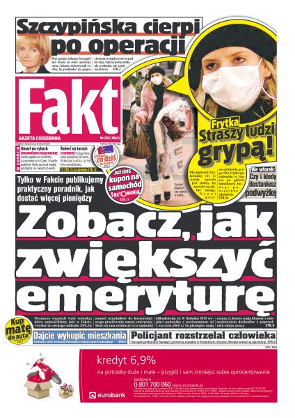 Jolanta Szczypińska cierpi po operacji; jak można powiększyć emeryturę; funkcjonariusz sopockiej policji Adam N. strzałem w głowę zabił Krzysztofa K. z Gdańska; Frytka zasłoniła twarz ochronną maską i siała panikę w centrum handlowym; Jan Kliment musi przez Nataszę Urbańską trenować tak długo, że nie ma czasu dla ukochanej; Tomasz Kuszczak wierzy, że dzięki grze w kadrze urośnie w oczach Fergusona; siatkarze mistrzów Polski, Skry Bełchatów, są drugą drużyną na świecie; Emma Thompson już nie broni Polańskiego.