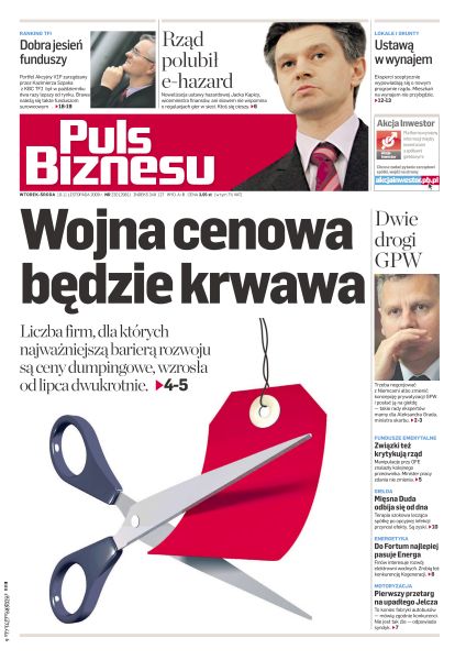 Liczba firm, dla których najważniejszą barierą rozwoju są ceny dumpingowe, wzrosła od lipca dwukrotnie; resort skarbu chce negocjować z Deutsche Boerse, jedynym chętnym na akcje GPW; gry i zakłady w sieci pozostaną poza kontrolą fiskusa; Wrocław będzie miał nową elektrociepłownię; deweloperom w budowaniu mieszkań pod wynajem może przeszkodzić ustawa o ochronie lokatorów; inkubatory technologiczne hodują innowacyjnych przedsiębiorców; już na drugiej sesji po debiucie inwestorzy przekonali się, że PGE to spółka defensywna.