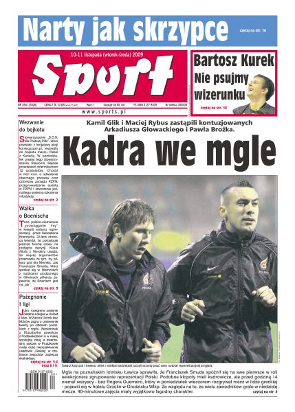 Kamil Glik i Maciej Rybus zastąpili kontuzjowanych Arkadiusza Głowackiego i Pawła Brożka; czterdziestominutowy rozruch zamiast treningu - tak wyglądały pierwsze zajęcia polskiej reprezentacji podczas zgrupowania w Grodzisku Wielkopolskim; uczestnicy Champions League poszli na wymianę ciosów, remisując 5-5; przed Asseco Prokomem wielkie wyzwanie - do Gdyni przyjeżdża mistrz Euroligi Panathinaikos Ateny; Justyna Kowalczyk cały czas szuka sposobu na to, by być lepszą.