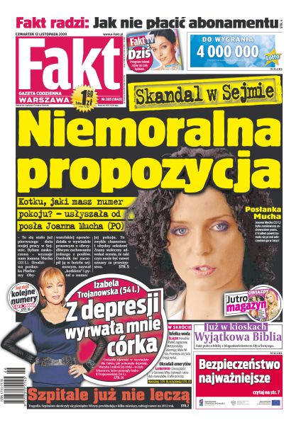 Szpitale przekroczyły kontrakty z NFZ i przestają leczyć; jak nie płacić abonamentu RTV; posłanka Joanna Mucha zdradza, do czego politycy posuwają się w hotelu sejmowym; Radosław K. powiesił się w celi aresztu, bo nie mógł znieść ciężaru winy; skandal w Dzierżoniowie - wiceprzewodniczący rady miejskiej po zakrapianej imprezie wszczął burdę z sąsiadem i rzucił się na policjantów; ekskluzywny wywiad z Izabelą Trojanowską; Urszula odzyskała radość i świetną figurę; Franciszek Smuda podczas zgrupowania reprezentacji forsuje na treningach niesamowite tempo; prezes PZPN chce uniemożliwić znanemu działaczowi udział w zjeździe.