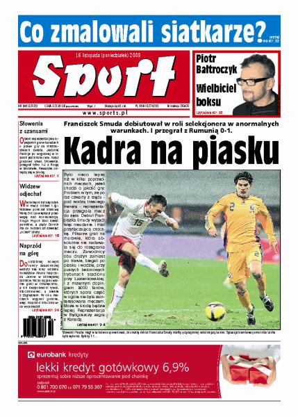 Franciszek Smuda debiutował w roli selekcjonera w anormalnych warunkach i przegrał z Rumunia 0:1; piękne jubileusze świętowali w sobotę Gianluigi Buffon i Iker Casillas – w swoich reprezentacjach zagrali po raz setny; Francja zbliża się do MŚ 2010; Egipt zagra w Sudanie z Algierią o prawo gry na finałach w RPA; Robert Kubica rozbił samochód; Anwil Włocławek przegrał z Polpharmą i doznał pierwszej porażki w tym sezonie.
