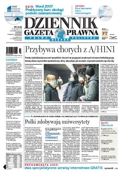 Prawie sześćdziesiąt procent wszystkich chorych na grypę jest zarażonych wirusem świńskiej grypy; po zniesieniu poboru do wojska studiuje coraz mniej mężczyzn, a polskim uczelniom grozi bankructwo; kursy językowe zostaną obłożone 22 proc. stawką VAT; wczoraj w Berlinie ukazała się pierwsza na świecie gazeta przygotowywana na życzenie klienta; służbie zdrowia brakuje pieniędzy dla pacjentów leczących się w innym miejscu, niż mieszkają; deweloperzy celowo zawyżają metraż lokali, aby wyłudzić więcej pieniędzy od klientów.