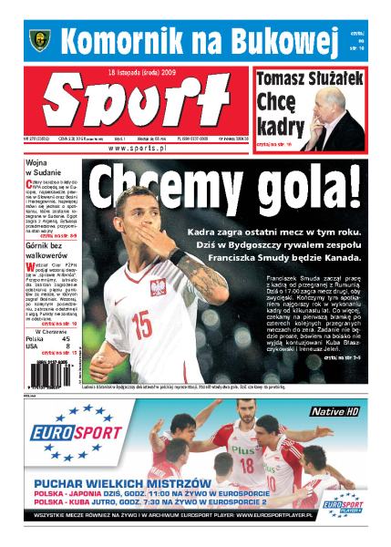 Dziś w Bydgoszczy kadra narodowa rozegra ostatnie spotkanie w tym roku, a rywalem zespołu Franciszka Smudy będzie Kanada; Tomasz Służałek chce poprowadzić reprezentację Polski koszykarzy; tegoroczny mistrz świata Formuły 1, Jenson Button, uzgodnił warunki trzyletniego kontraktu z ekipą McLarena-Mercedesa; GKS Katowice ma poważne problemy finansowe; hokejowy sezon może zostać skrócony z sześciu do czterech rund.