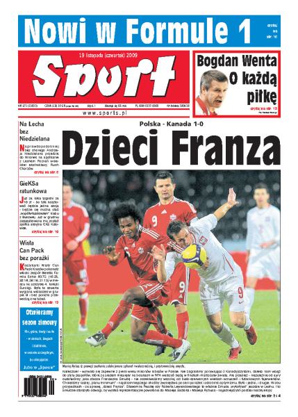 Polska wygrała z Kanadą 1:0 i przerwała serię 389 minut gry bez strzelenia gola; analiza gry poszczególnych zawodników polskiej reprezentacji; Ukraińcy zaprzepaścili wielką szansę wyjazdu na mistrzostwa świata do RPA; przed meczem z Lechem Poznań Ruch Chorzów ma poważne problemy kadrowe; już niebawem za 10 zł będzie można stać się „współwłaścicielem” GKS Katowice; w przyszłym sezonie rywalizację w Formule 1 urozmaicą cztery nowe zespoły.